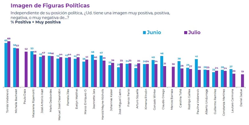 En la evaluación de figuras políticas, el alcalde de Maipú, Tomás Vodanovic (FA) encabeza el ranking con un 68% de imagen positiva. Le siguen la expresidenta Michelle Bachelet (57%) y Paula Daza (52%), quien a inicios de mes se incorporó como vocera de la campaña de la candidata de Chile Vamos.