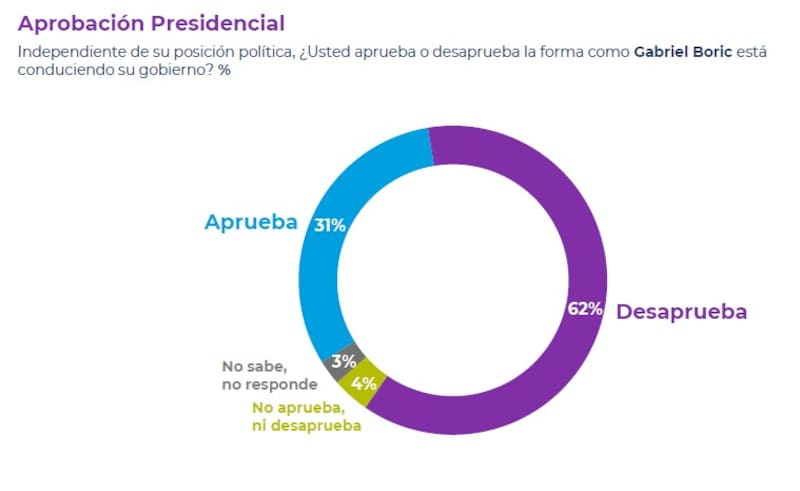 Finalmente, la aprobación del Presidente Gabriel Boric sufre una caída significativa, bajando a 31% (-7 puntos), mientras que su desaprobación sube a 62% (+7).