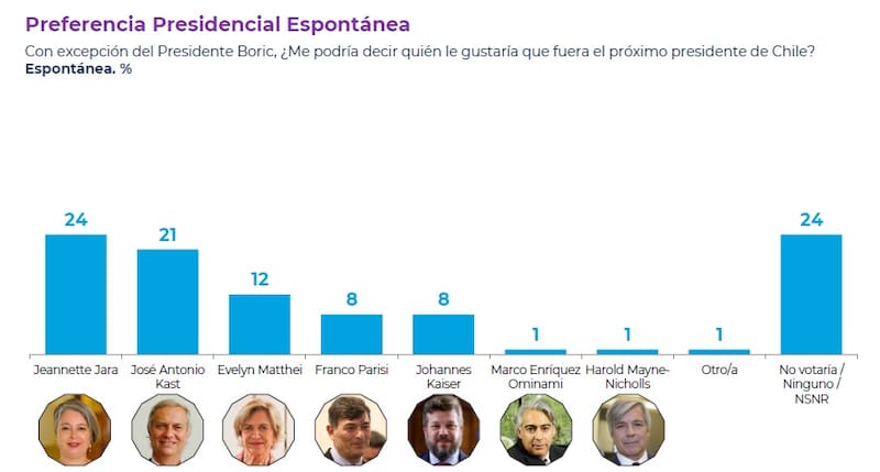 Según el sondeo de opinión, la candidata del bloque de centroizquierda, Jeannette Jara, continúa liderando la preferencia presidencial espontánea, siendo respaldada por un 24% de los consultados, pese a registrar una caída de cuatro puntos porcentuales en relación a la medición anterior.