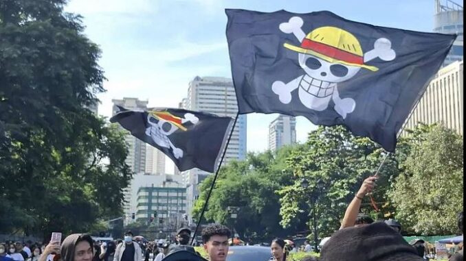 En segundo lugar, la bandera del manga One Piece se volvió una lingua franca juvenil. Se trata de la calavera utilizada por los piratas (Jolly Roger), con un “sombrero de paja”, nombre dado a la tripulación comandada por el capitán Monkey D. Luffy, personaje principal del manga. Esto alude a la épica de “piratas contra un poder corrupto”, que en el caso de One Piece es denominado “Gobierno Mundial”. Este símbolo se mezcla con códigos locales para cada país, bajando la barrera de entrada a la movilización, y viajando sin traducción en países con idiomas y culturas muy distintas entre sí. No es primera vez que los símbolos de la cultura pop aparezcan en manifestaciones: en 2011 los movimientos Occupy utilizaron la máscara de V for Vendetta; el maquillaje del Joker en protestas del 2019 (Hong Kong, El Líbano, Chile); el saludo de los tres dedos de la saga Hunger Games (Myanmar, Hong Kong, Tailandia).