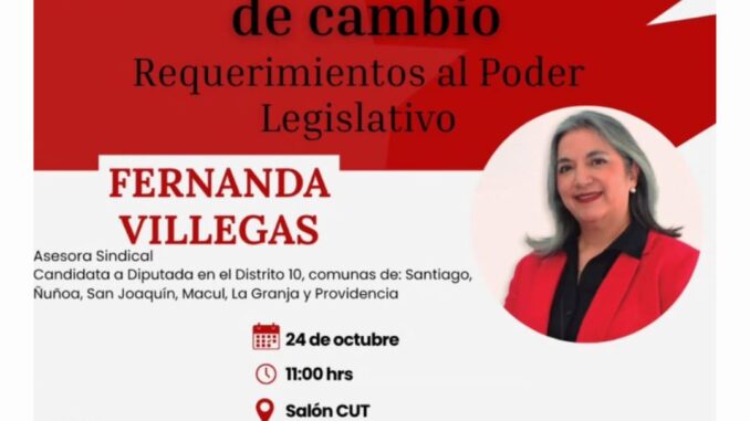 Este viernes 24 de octubre, a las 11:00 horas, se realizará en la CUT Chile (Alameda 1346) una conversación abierta con María Fernanda Villegas, Directora de CETRA y candidata a diputada por el Distrito 10. El encuentro convoca a dirigentes, trabajadoras y trabajadores, y ciudadanía interesada en debatir sobre desafíos del mundo del trabajo, derechos sociales y transformaciones necesarias desde el poder legislativo.