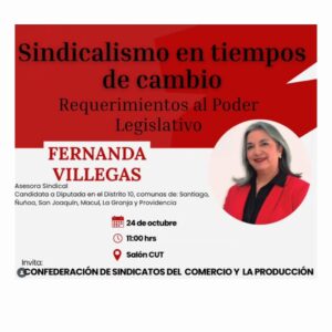 Este viernes, en la sede de la Central Unitaria de Trabajadores (CUT), la Directora de CETRA y candidata a diputada por el distrito 10, María Fernanda Villegas, sostuvo un encuentro con dirigentes y dirigentas sindicales para dialogar sobre los desafíos actuales del movimiento sindical y la defensa de los derechos laborales en el país.