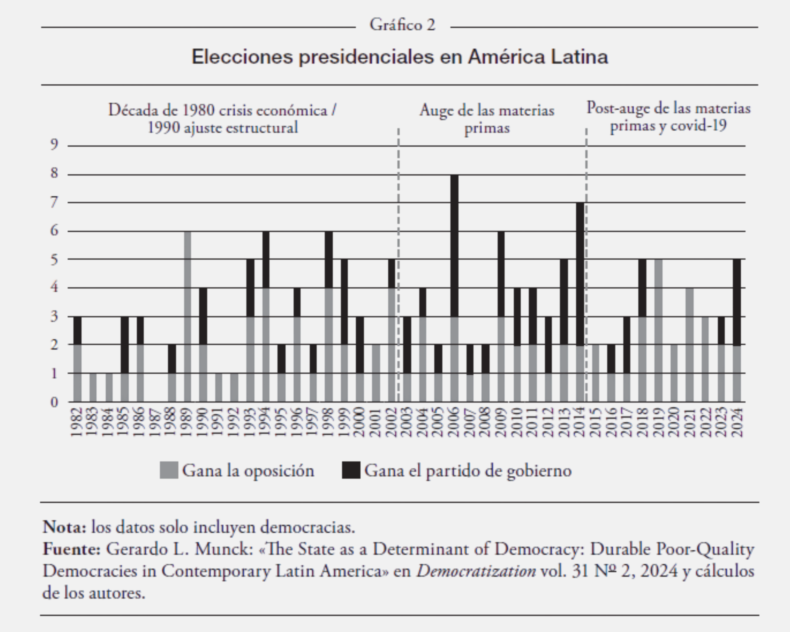 El gráfico 2 se enfoca en las elecciones democráticas de la región desde la década de 1980. El negro refleja las victorias del partido de gobierno y el gris, las de la oposición. El cambio de colores ilustra la tendencia a la reelección de los partidos de gobierno durante el periodo de auge económico y la prevalencia de sus derrotas en la década de descontento.