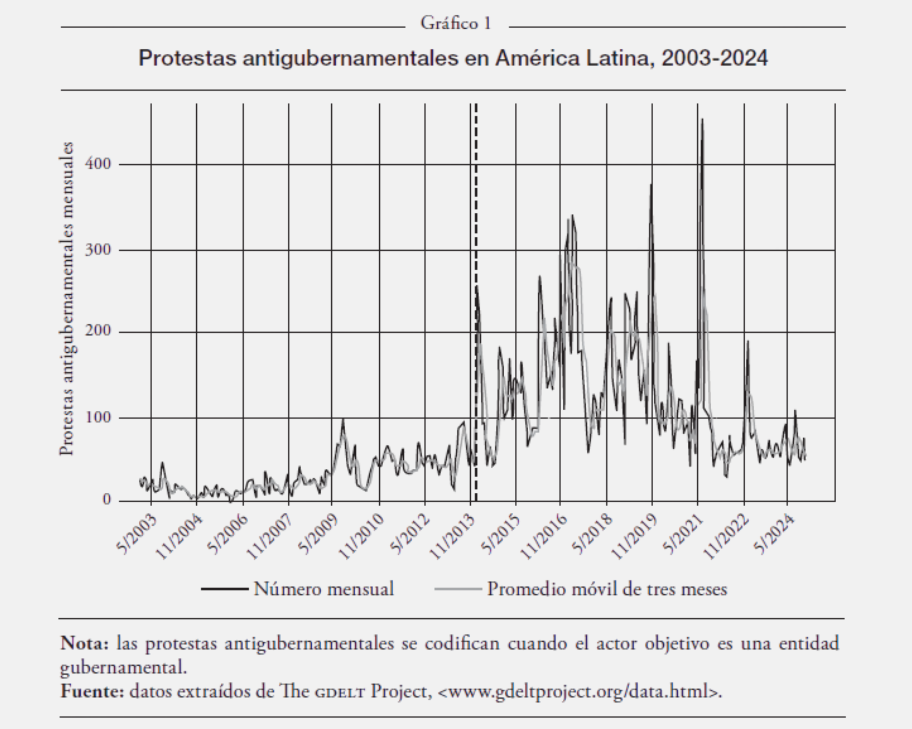 Pese a estas mejoras sociales, la década posterior al auge de las materias primas se caracterizó por el descontento político expresado en un aumento del voto en contra de los oficialismos, así como de las protestas antigubernamentales, como se puede ver en los siguientes gráficos. El gráfico 1 describe las protestas antigubernamentales en la región desde 2003 hasta 2024 y muestra un aumento significativo en la última década, comparado con el periodo de auge de las materias primas.