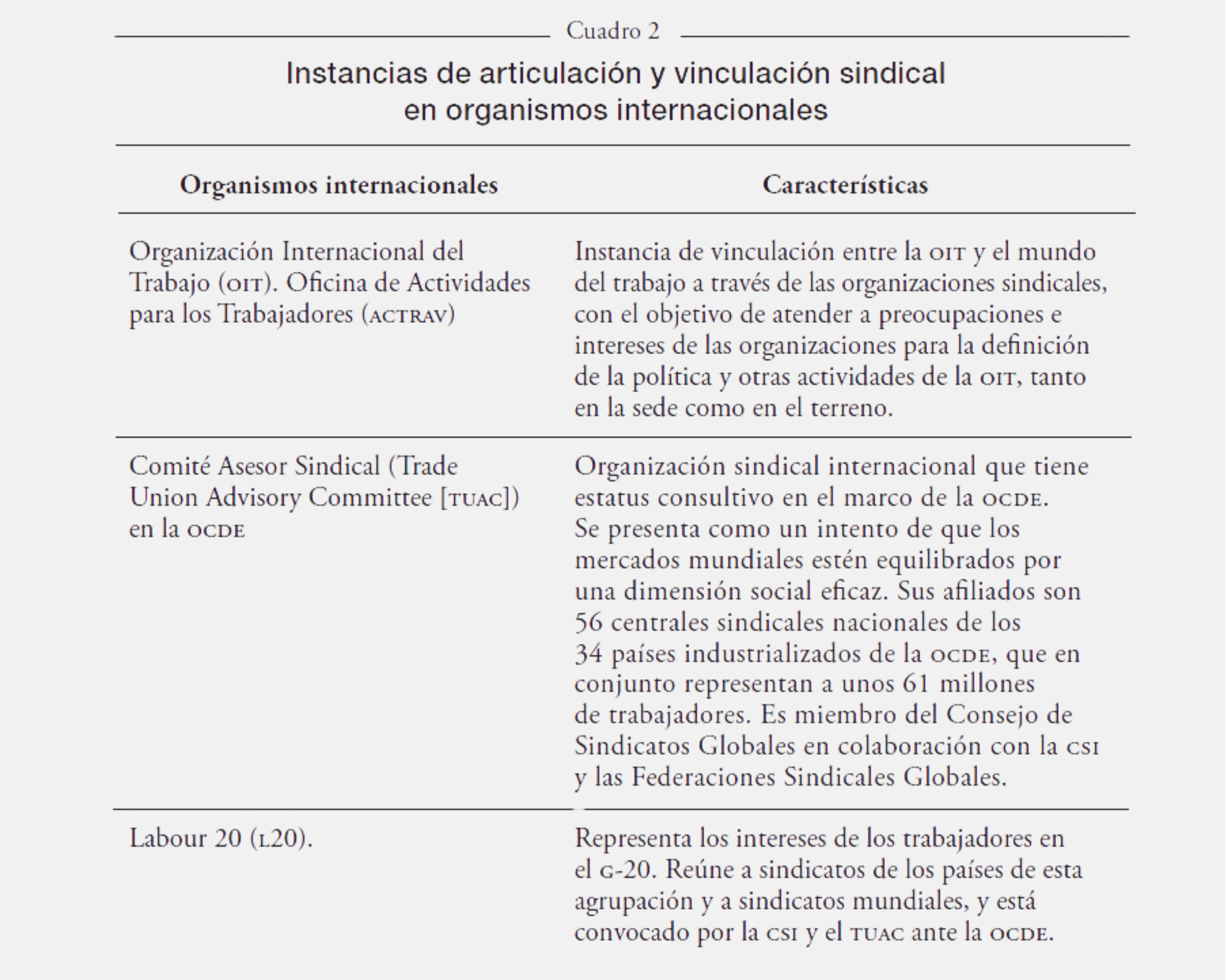 El conflicto y las formas de protesta y de confrontación, componente indisoluble de la acción sindical junto con la negociación, aparecen solo de manera secundaria en las preocupaciones y tareas de la mayoría de estas organizaciones. Si estas estructuras pudieran orientarse a elaborar una radiografía de las estructuras de poder y a detectar elementos estratégicos que fueran punto de partida para la planificación global de medidas de fuerza y la reconfiguración de formas contemporáneas de la huelga, en un tiempo de retroceso en las relaciones laborales y los derechos, el impacto del entramado de instituciones del sindicalismo internacional podría incrementarse en forma notable.