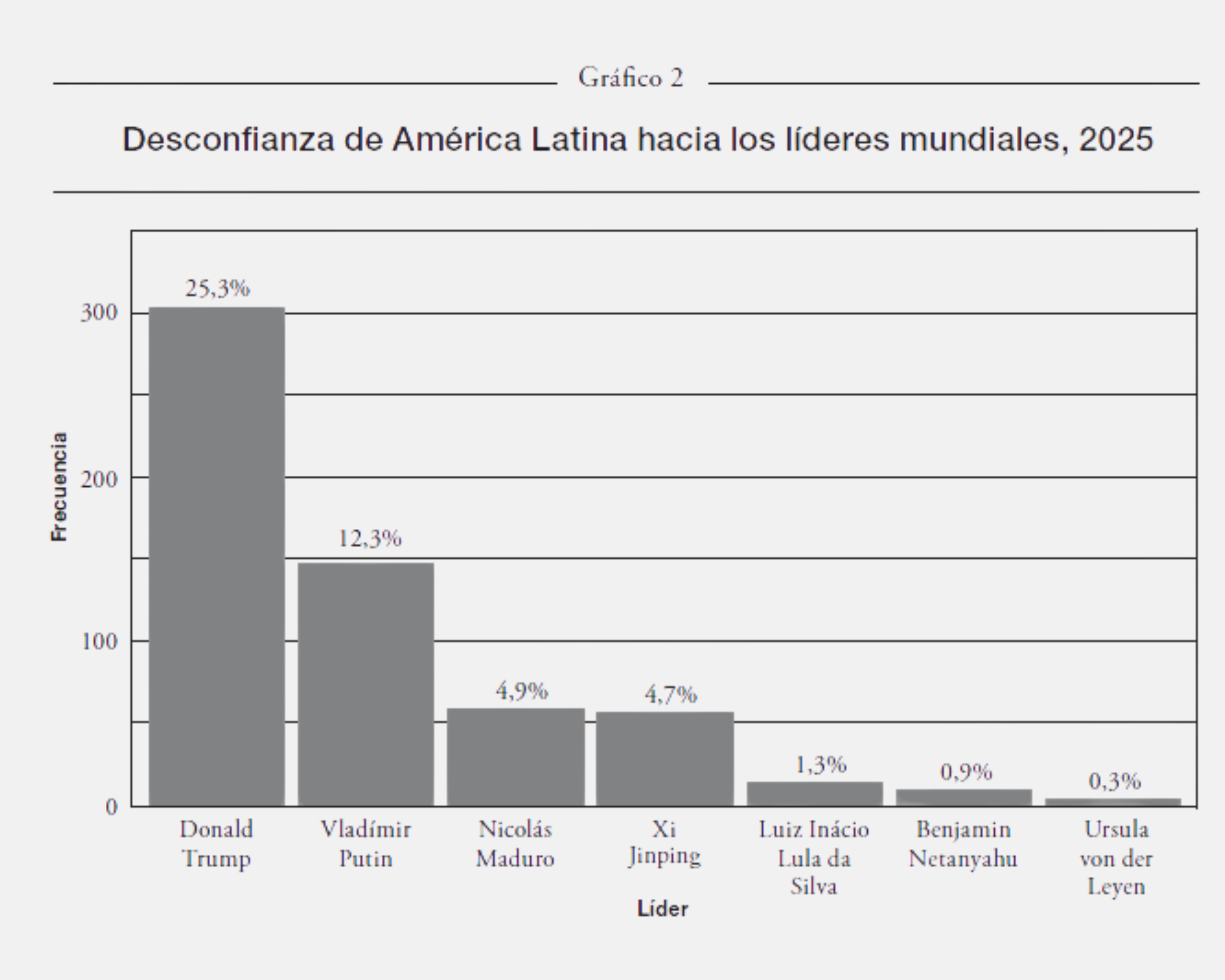 Nota: respuesta a la pregunta: «Dígame cuál es el líder mundial en el que usted confía menos». Fuente: FES, Nueva Sociedad, Grupo Diálogo y Paz y Latinobarómetro: «Encuesta sobre las relaciones entre América Latina y Europa», 2025.