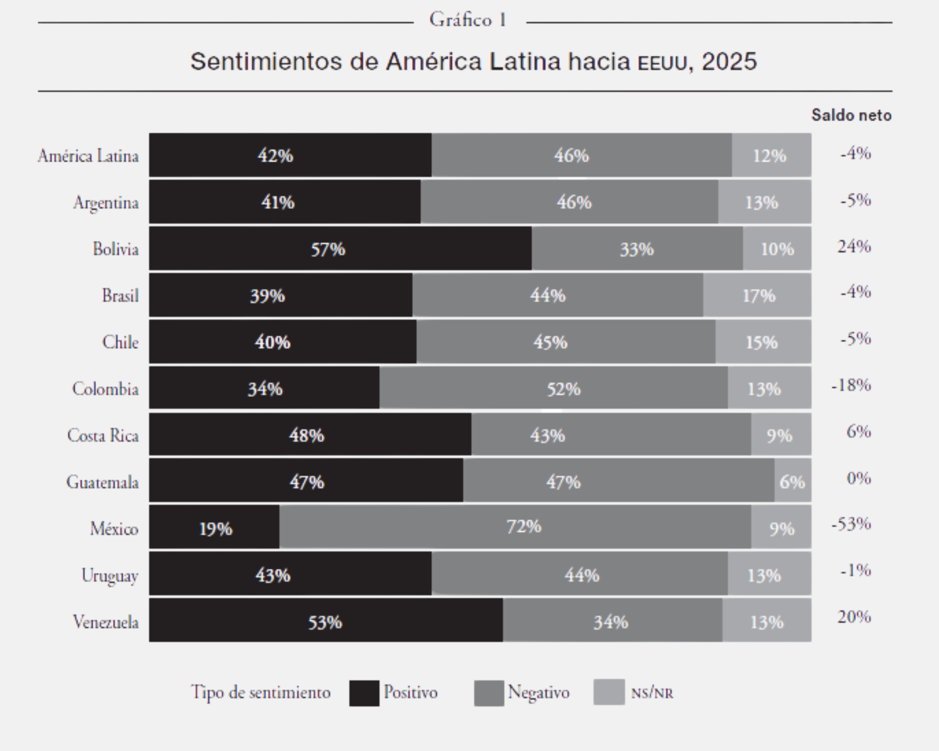 Nota: respuesta a la pregunta: «De las siguientes palabras, ¿cuál describe mejor sus sentimientos hacia EEUU?». Saldo neto = porcentaje de sentimientos positivos – porcentaje de sentimientos negativos. El saldo neto puede presentar un error de ±1% debido al redondeo de las cifras. Las barras pueden no sumar 100% debido al redondeo de las cifras. Fuente: FES, Nueva Sociedad, Grupo Diálogo y Paz y Latinobarómetro: «Encuesta sobre las relaciones entre América Latina y Europa», 2025.