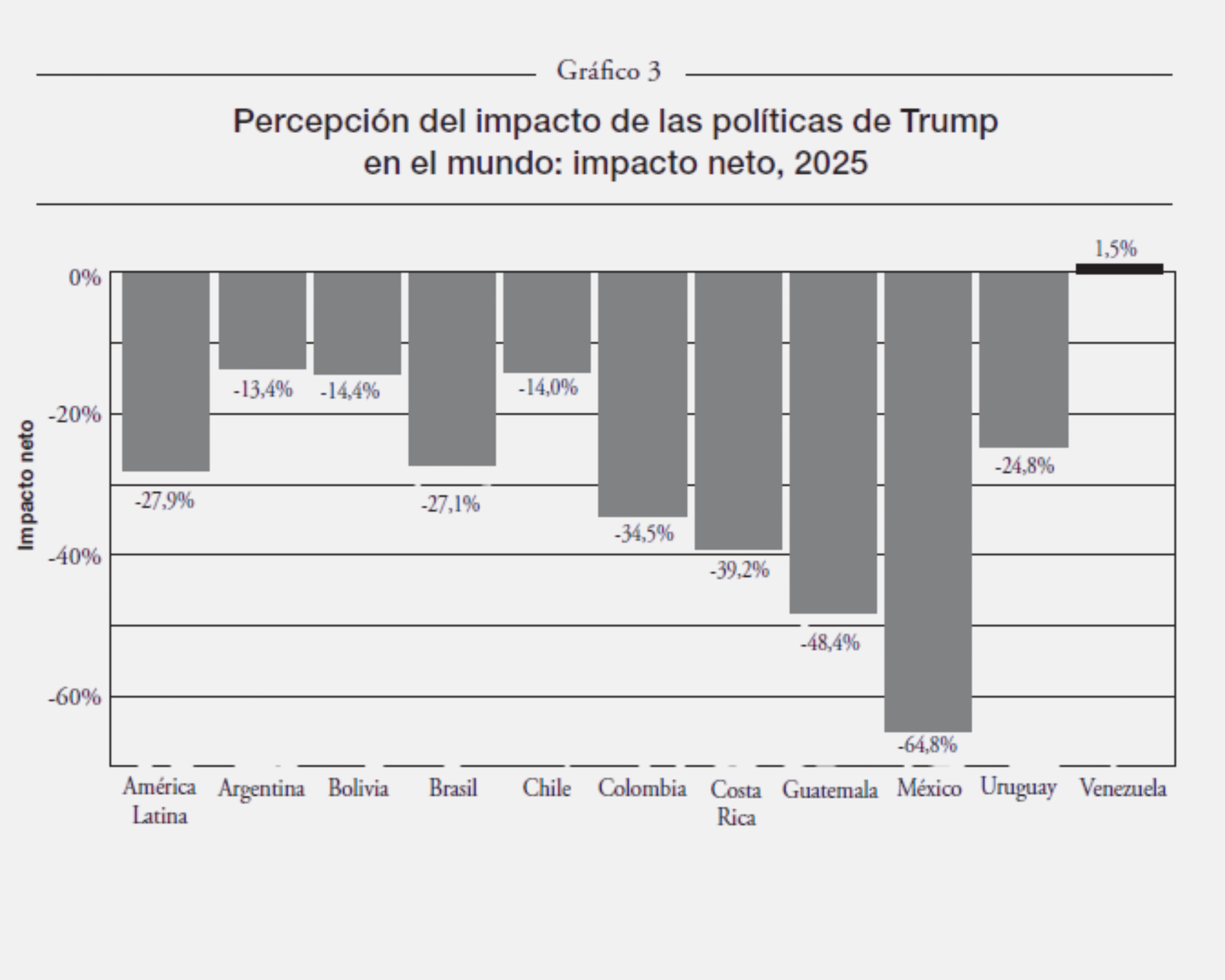 Nota: respuesta a la pregunta: «Por lo que sabe o ha escuchado, ¿cómo cree usted que será el impacto de las políticas que está implementando el presidente de Estados Unidos, Donald Trump, en el mundo?». Impacto neto = porcentaje de impactos muy positivos y positivos – porcentaje de impactos muy negativos y negativos. Fuente: FES, Nueva Sociedad, Grupo Diálogo y Paz y Latinobarómetro: «Encuesta sobre las relaciones entre América Latina y Europa», 2025.