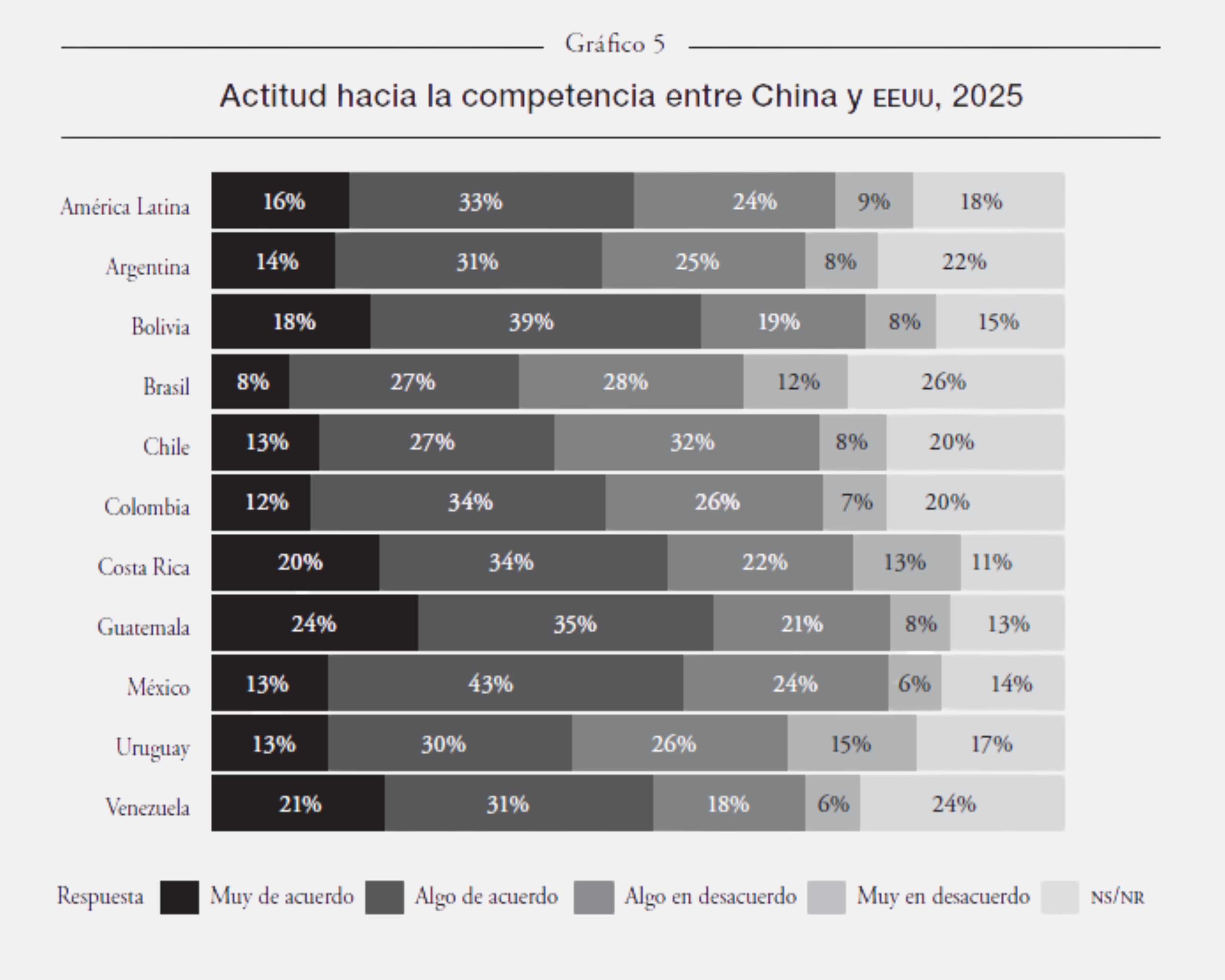 Sin embargo, el déficit hegemónico estadounidense no se agota en el plano emocional o valorativo. Se proyecta también en la manera en que las sociedades latinoamericanas perciben la posición estructural de sus países en la competencia geopolítica global entre las grandes potencias, en particular entre eeuu y China (v. gráfico 5). Cuando se les pregunta si su país se ve forzado a tomar partido en esa disputa, casi la mitad de los encuestados a escala regional (49%) está de acuerdo o muy de acuerdo con la afirmación, lo que revela una percepción extendida de presión externa y margen de maniobra reducido. En contraste, 31% rechaza esa idea, lo que sugiere que una parte significativa de la región aún percibe espacios de autonomía y la posibilidad de sostener estrategias de no alineamiento y equidistancia.