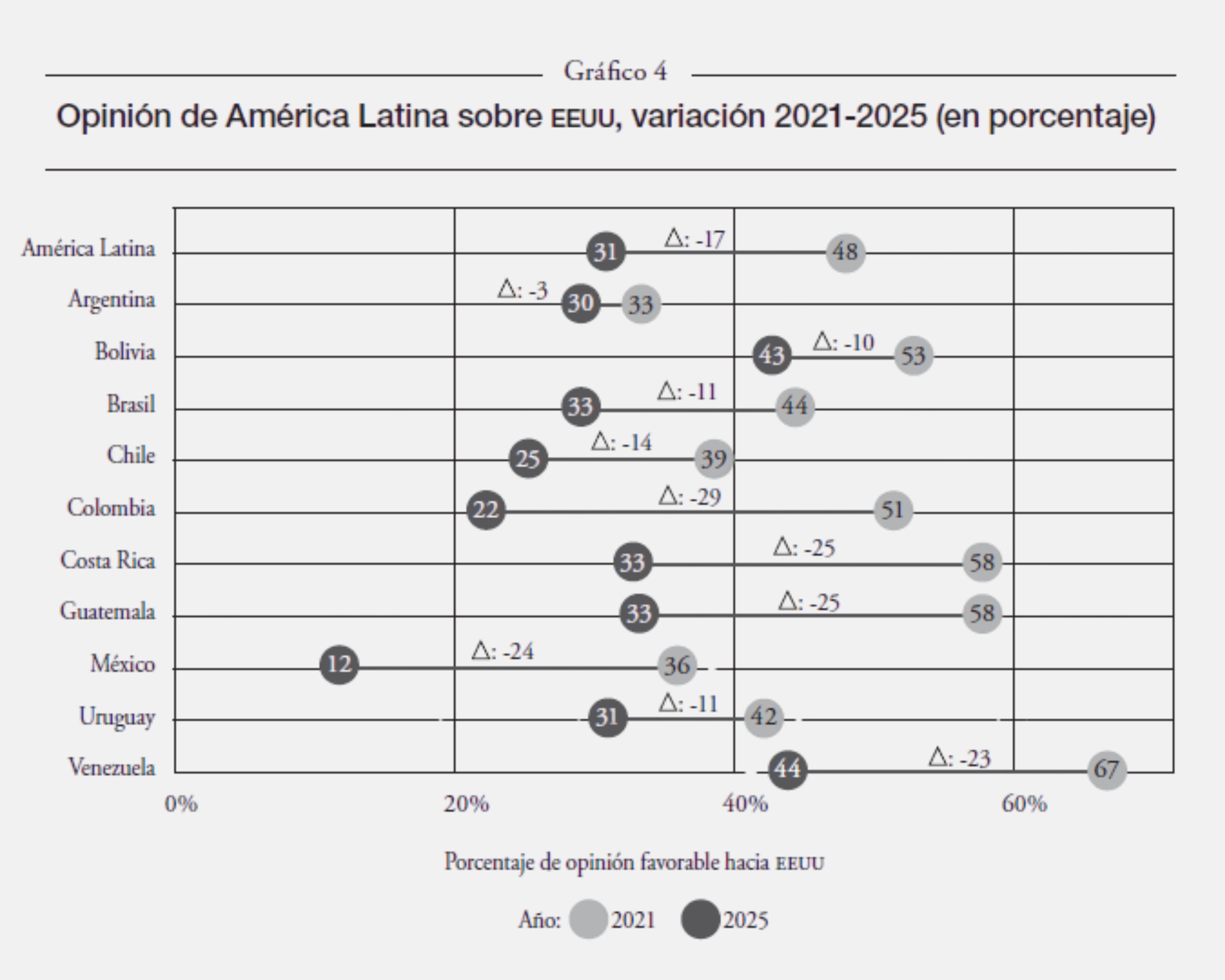 Otros resultados de la misma encuesta evidencian el alto costo reputacional que ha tenido para eeuu el giro hacia un ejercicio del poder asentado en la coerción y la imposición bajo el proyecto maga del segundo mandato de Trump. Entre 2021 y 2025, la opinión favorable hacia eeuu cae de manera generalizada en la región, con un descenso promedio de 17 puntos porcentuales (v gráfico 4). Las caídas no son marginales y resultan más pronunciadas en países con vínculos históricos, económicos y políticos estrechos que han resentido con mayor intensidad los embates trumpistas, como Colombia (-29), Costa Rica (-25), Guatemala (-25) y México (-24). El deterioro alcanza también a socios sudamericanos relevantes como Chile (-14), Brasil (-11) y Uruguay (-25), lo que confirma un desgaste transversal del atractivo estadounidense.